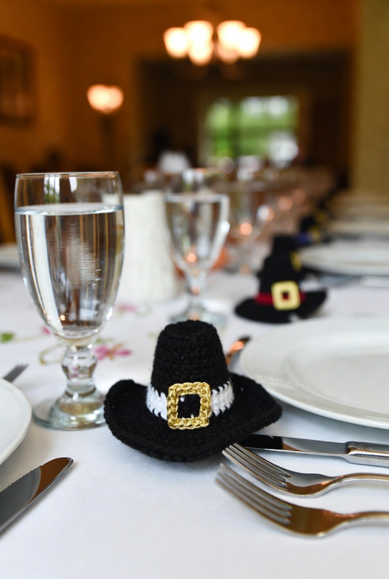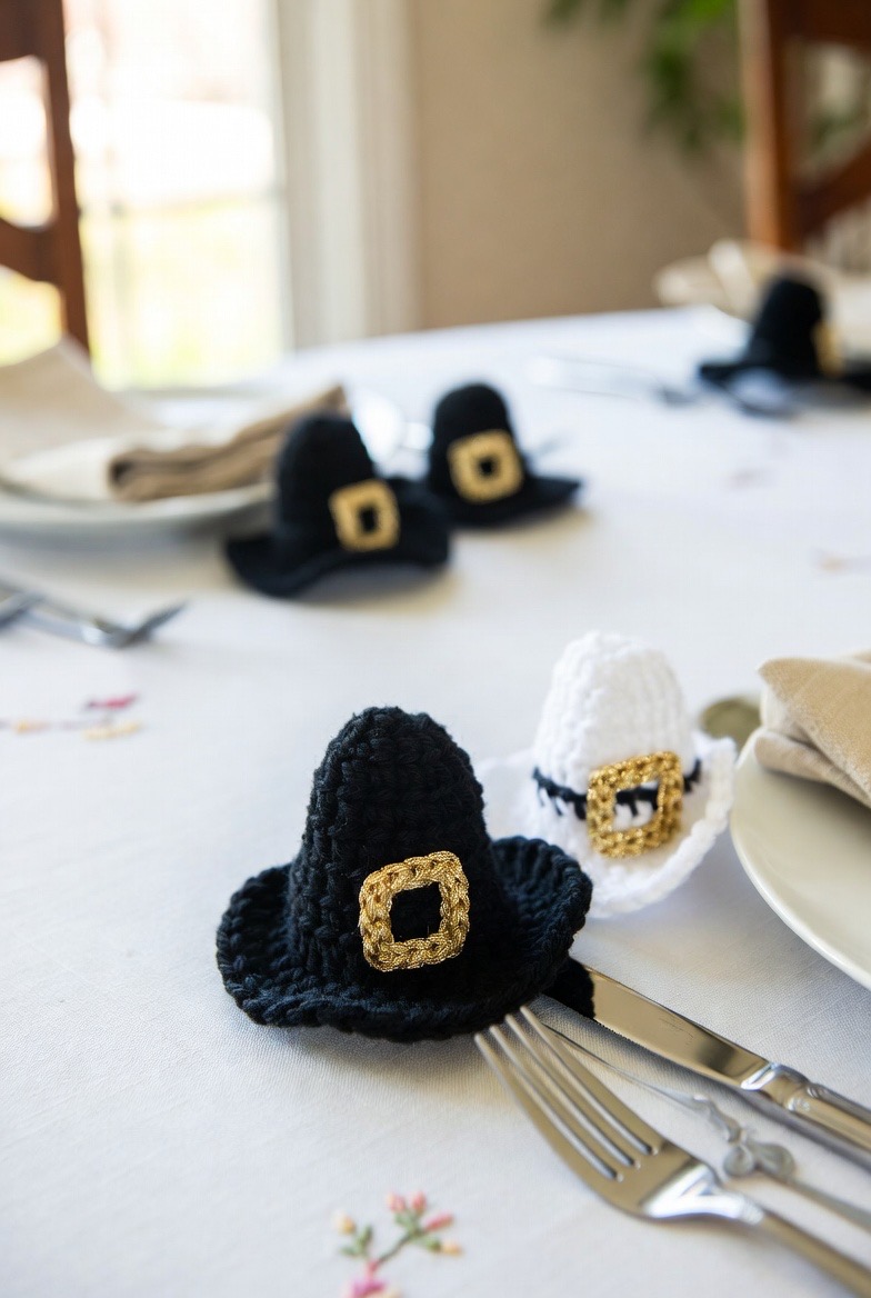 Adding a small handmade touch to each place setting makes your guests feel incredibly special. Small crochet pilgrim hats that slide over the handles of your forks and knives are a charming way to dress up the table. They are simple to make using black and white yarn with a tiny gold buckle detail. These wraps keep the cutlery neatly organized and provide an extra layer of protection for your tablecloth. It is these small, thoughtful additions that turn a standard dinner into a memorable event that people will be talking about long after the leftovers are gone.