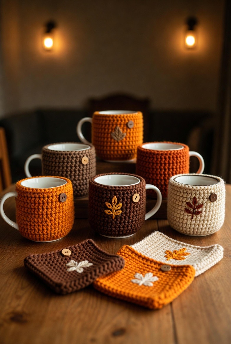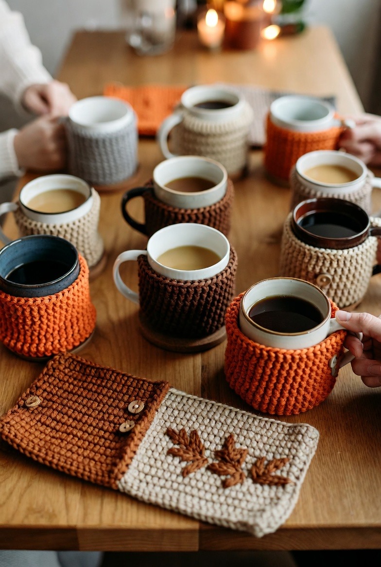 As the evening winds down and everyone gathers for coffee or cider, a set of crochet mug cozies keeps the drinks warm and the hands cool. You can decorate these ‘sweaters’ with small wooden buttons or tiny embroidered leaves. They add a layer of comfort to the post-dinner chill and prevent rings on your wooden tables. Making a set in a variety of autumnal colors ensures that everyone knows which mug is theirs, blending practical organization with a soft, handmade touch that feels like a hug for your hands.