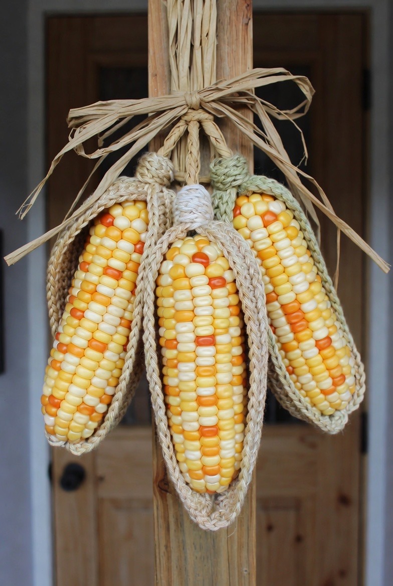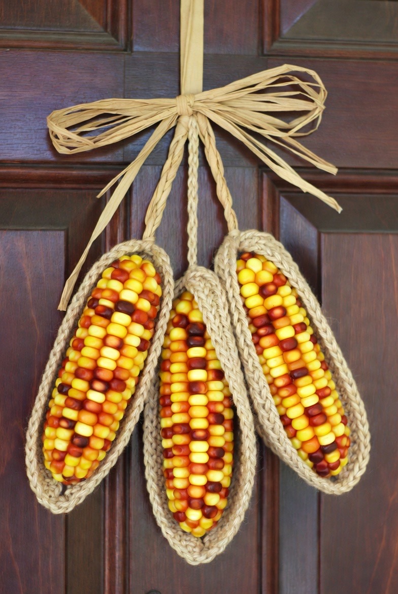 A trio of colorful ears of corn tied together with a raffia ribbon is a beautiful alternative to a traditional wreath. You can use variegated yarn to mimic the unique, multi-colored kernels of flint corn, creating a textured surface that is visually fascinating. Hanging these on the front door or a pantry door brings a burst of rustic color to your home’s entry points. It is a durable decoration that stands up well to the elements and provides a warm, country-style welcome to everyone who enters your home during the holiday season.