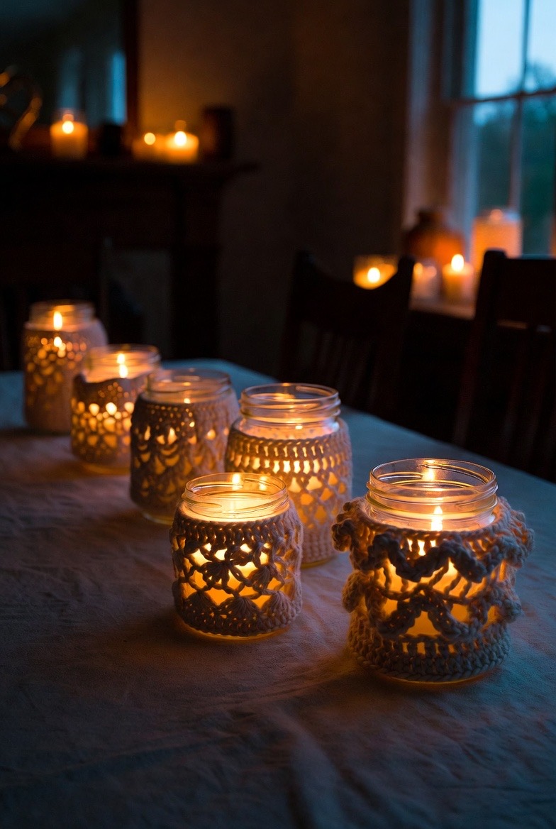 Lighting is key for a cozy Thanksgiving atmosphere, and crochet candle cozies can transform standard glass jars into glowing lanterns. A simple lacy or scalloped pattern allows the flickering candlelight to shine through the gaps, casting beautiful shadows across the room. Using a neutral cream or tan yarn ensures that the focus remains on the light itself while adding a layer of softness to the hard glass surface. These are perfect for lining the center of a long table or placing on a mantle to create a warm, inviting glow that lasts all evening.