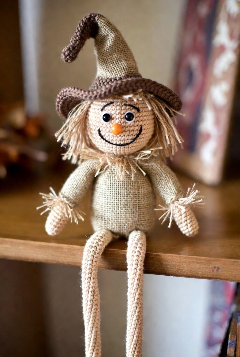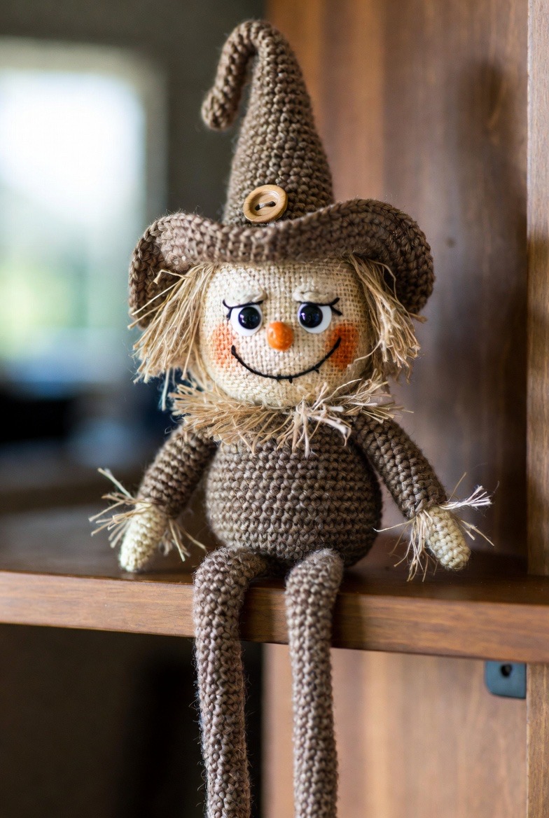 To add a bit of whimsy to your bookshelf or mantle, a long-legged scarecrow shelf sitter is the perfect choice. With a floppy hat, a burlap-colored face, and tiny strands of yarn ‘straw’ peeking out from his sleeves, he brings a playful sense of humor to your autumn display. He can sit on the edge of a shelf with his legs dangling down, filling those vertical spaces in your decor that are often hard to reach. He is a friendly guardian of the harvest who adds a touch of childhood wonder to your sophisticated holiday home.