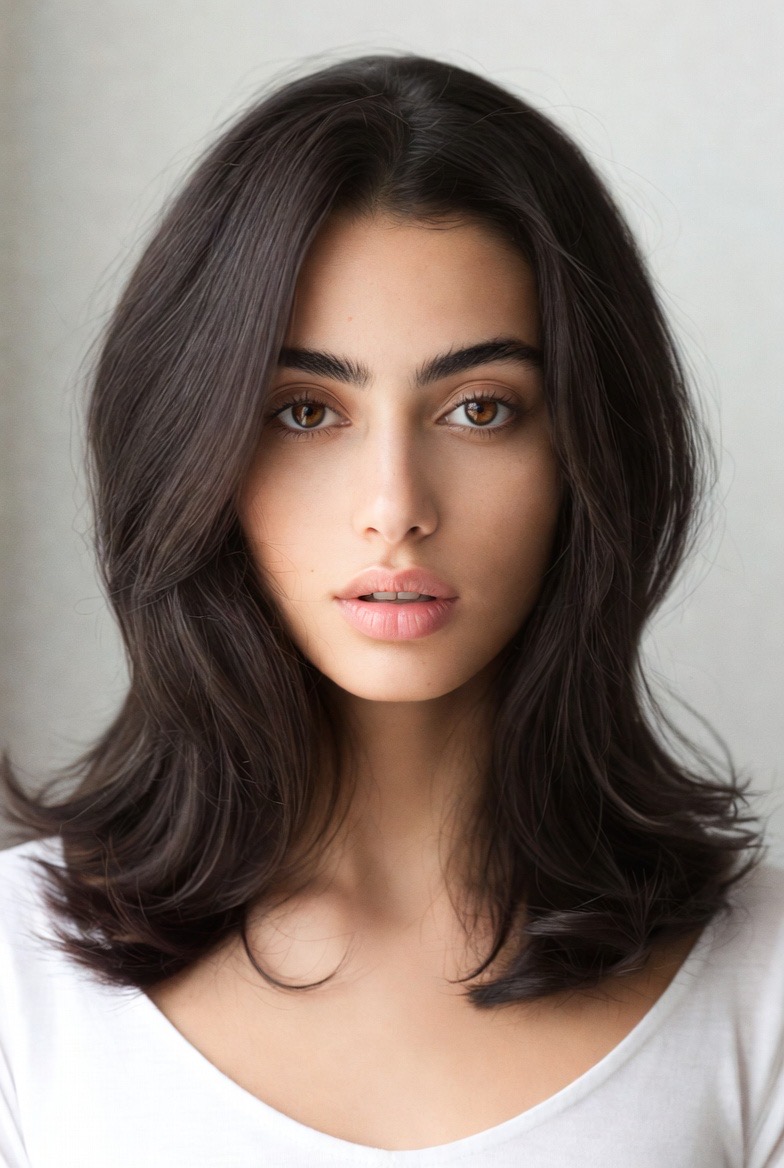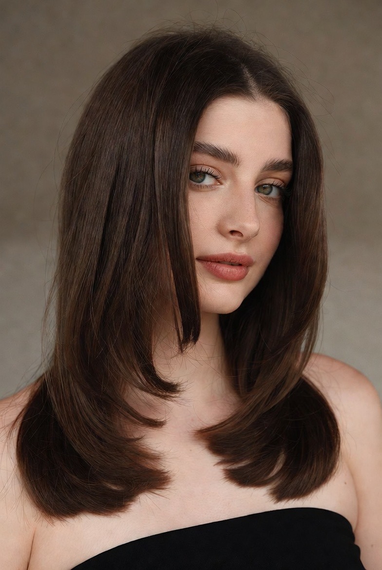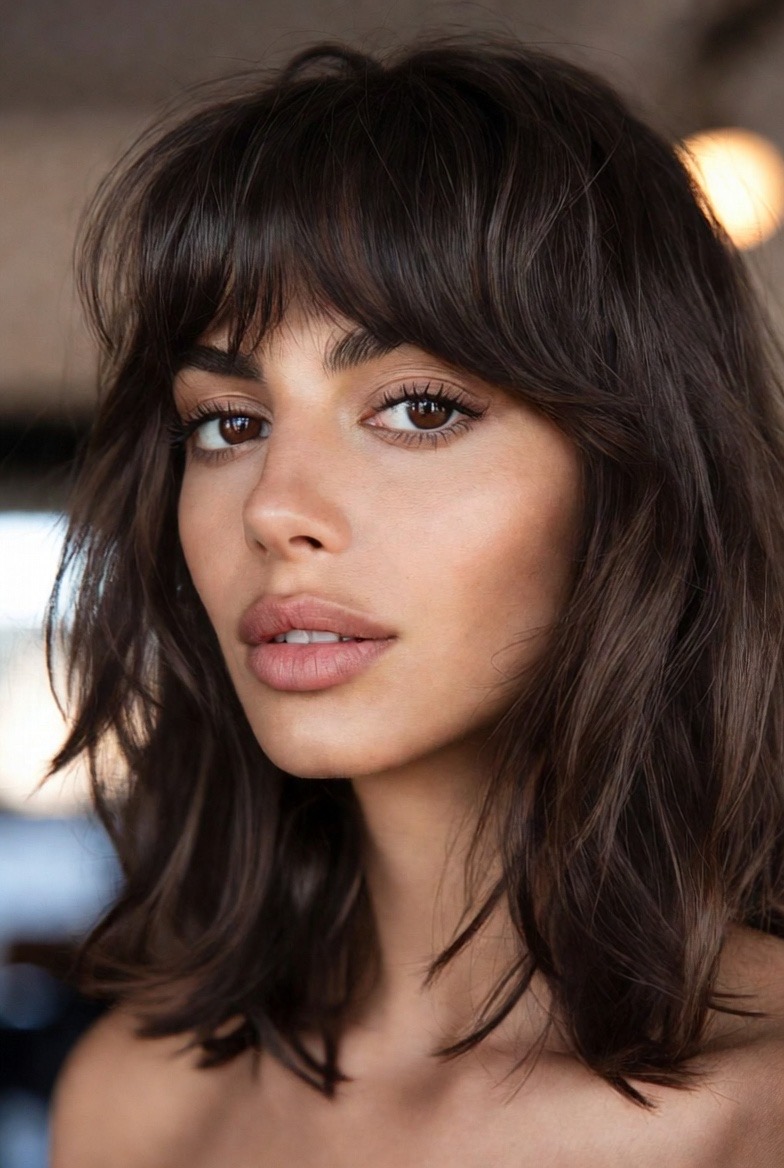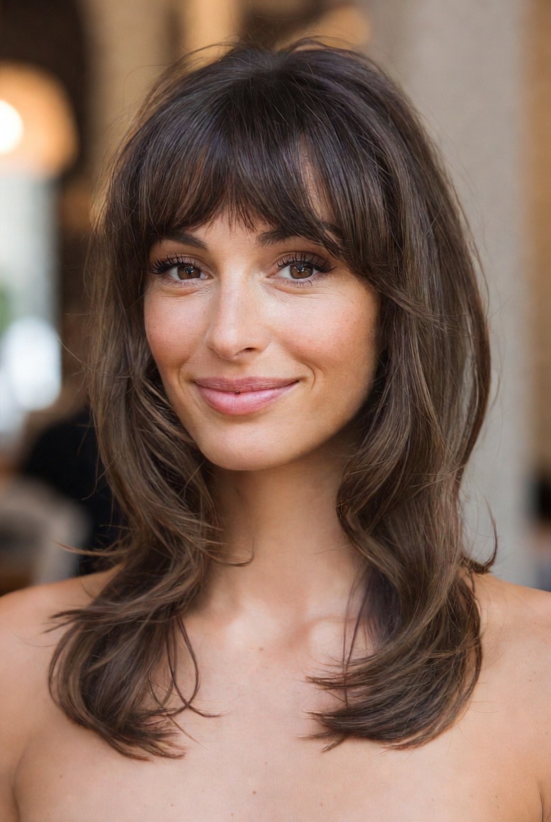Curtain bangs are the perfect partner for medium-length layers. Instead of having a blunt separation between your fringe and the rest of your hair, your stylist can blend the bangs into the side layers. This creates a seamless flow of hair that sweeps back away from the face in a beautiful C-shape. This style is reminiscent of the effortless French-girl aesthetic, chic, slightly undone, and very romantic. It is an excellent way to update your look without losing any of your overall length.
