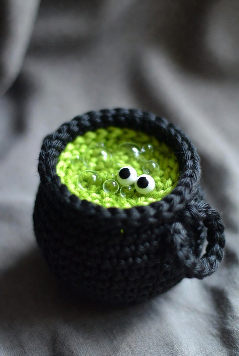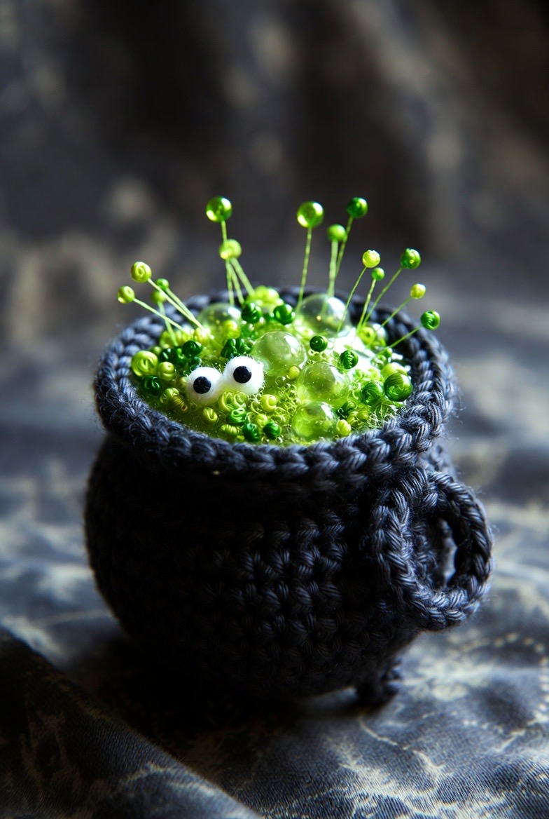 A tiny, deep-black cauldron filled with a lime-green ‘liquid’ is a classic. You can add texture to the brew by using French knots to simulate bubbles popping at the surface. It serves as a perfect centerpiece, or you can even tuck a few spare crochet eyes inside for a truly mystical look.
