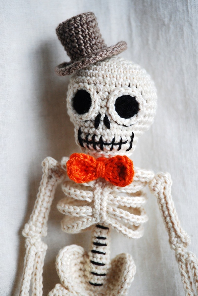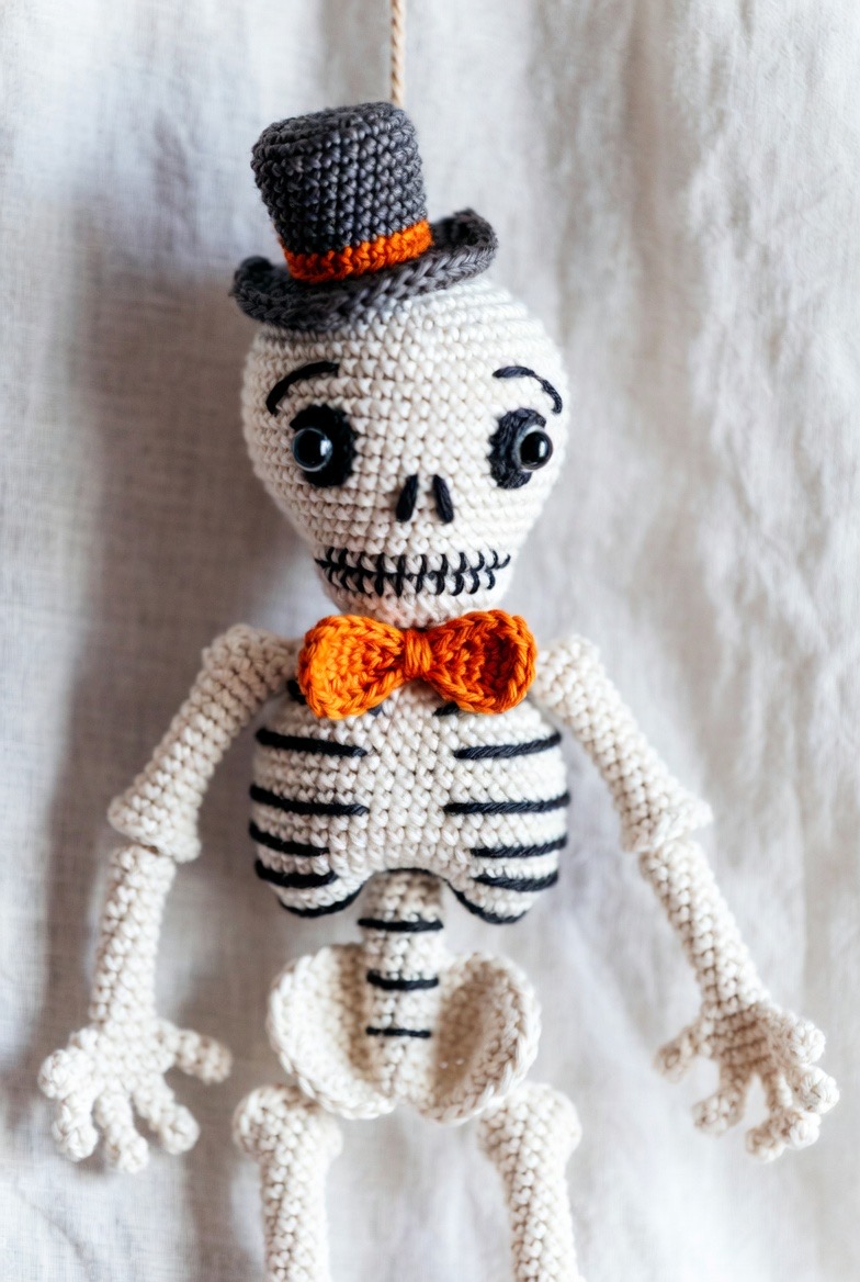 To make a skeleton feel more ‘whimsical’ and less macabre, give him a dapper accessory. A tiny top hat or a bright orange bowtie adds a pop of color against the white yarn. Use a thin black embroidery thread to define the ribs and the hollows of the eyes for a clean, graphic finish.