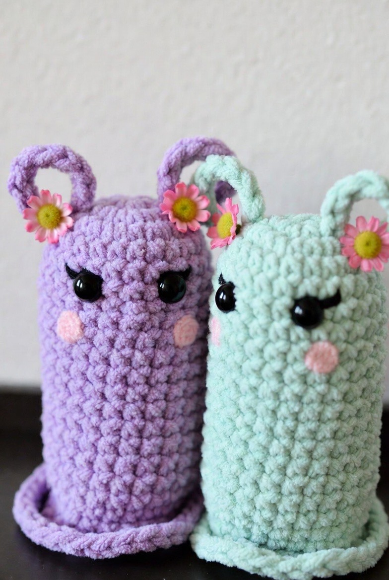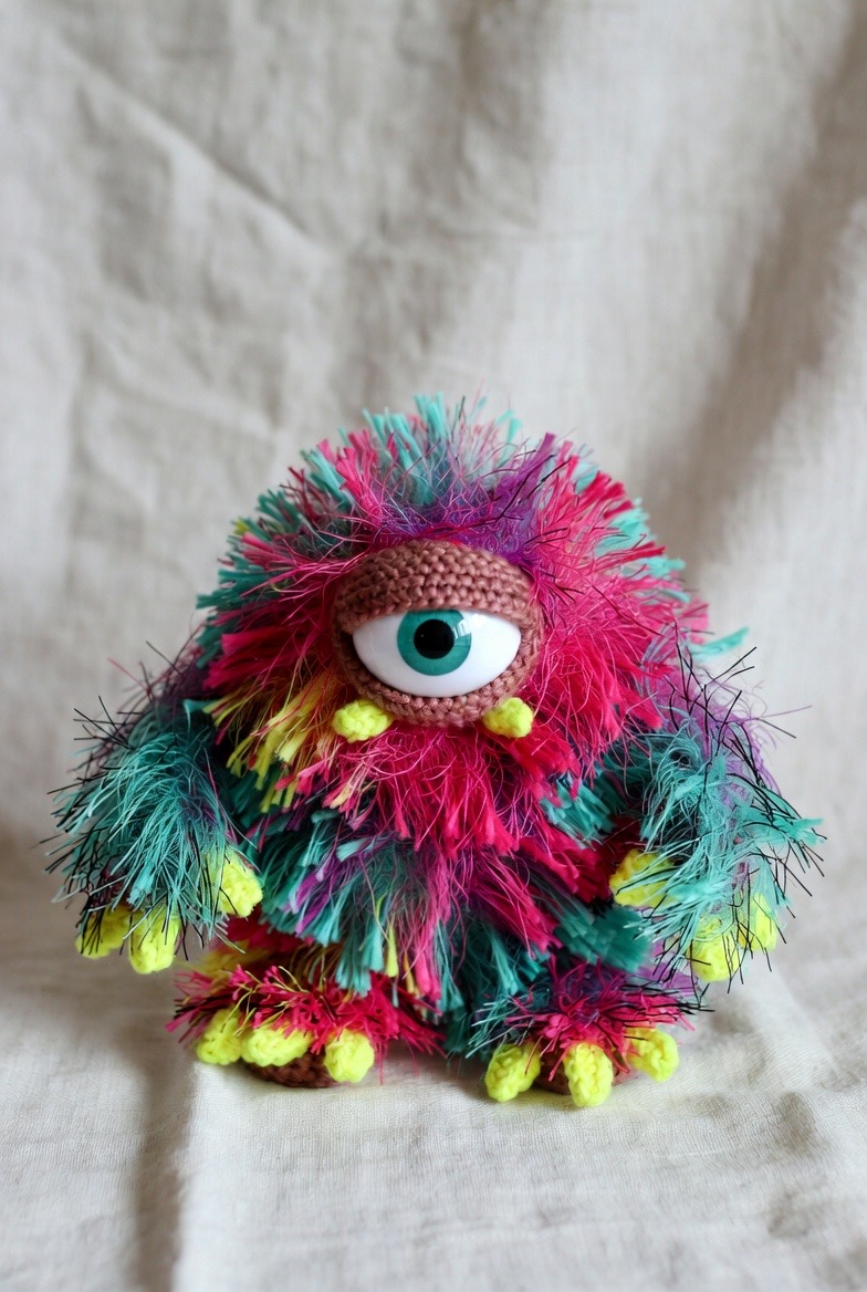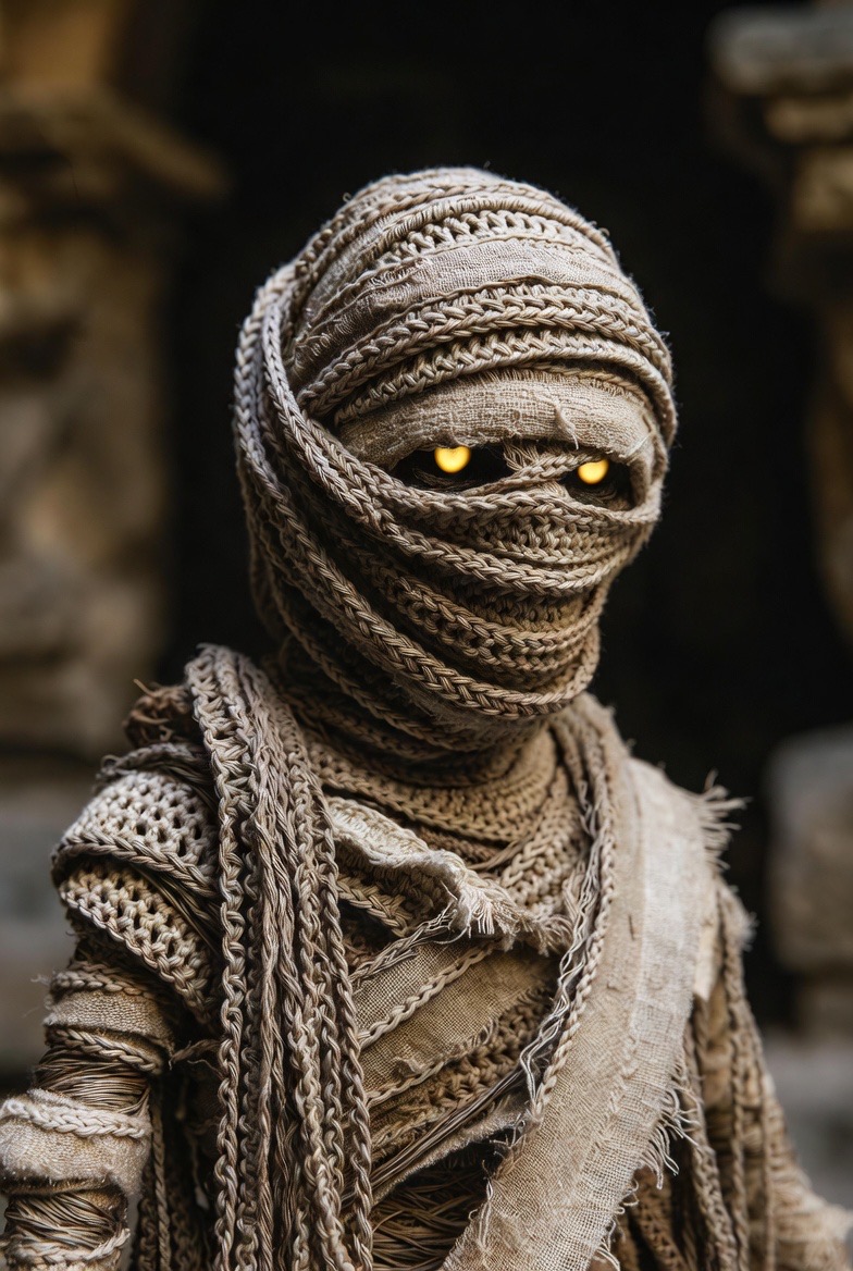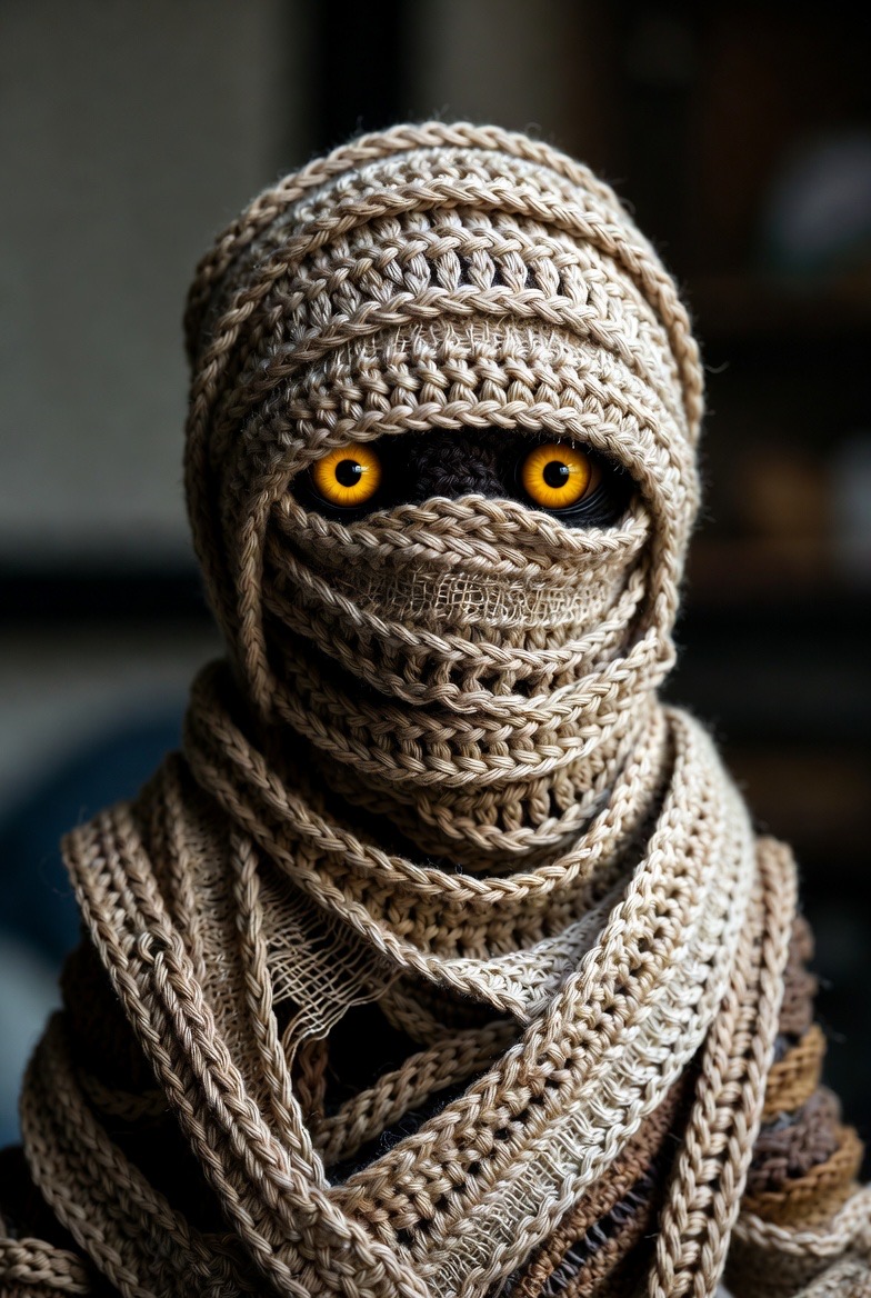 Instead of a smooth surface, use the ‘back loops only’ technique or wrap a long, thin crochet chain around a base body to create the look of ancient bandages. Peeking out from between the layers, two glowing yellow eyes add a sense of mystery and depth to this ancient traveler.