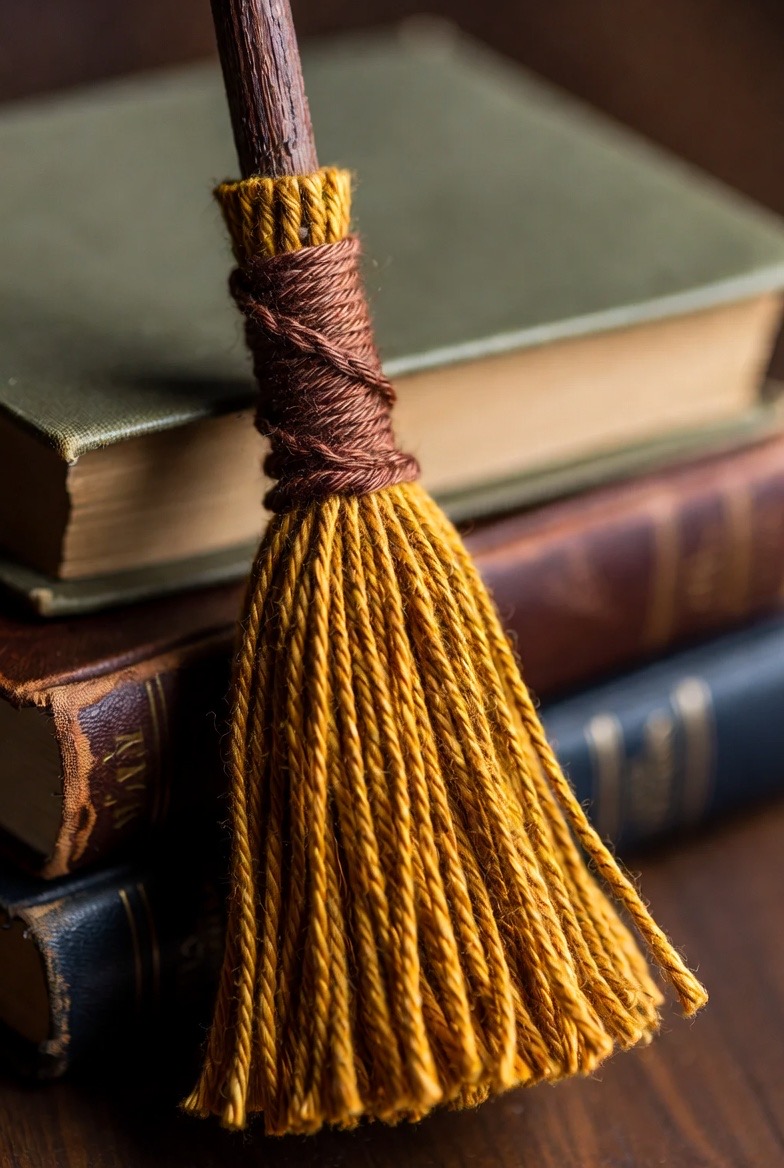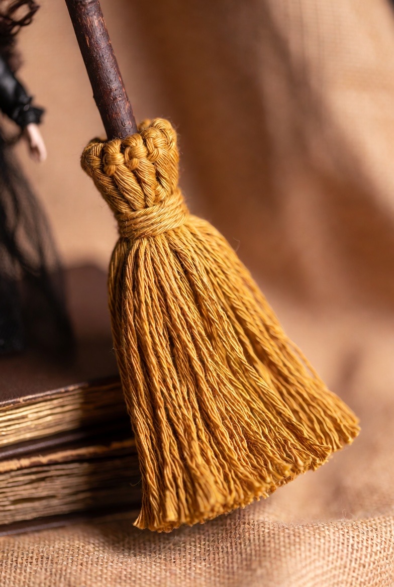 A miniature broomstick is a great way to practice working with different textures. Use a wooden dowel for the handle and unraveled twine or a stiff mustard-yellow yarn for the bristles. It’s a simple addition that looks wonderful when propped against a stack of books or held by a witch doll.