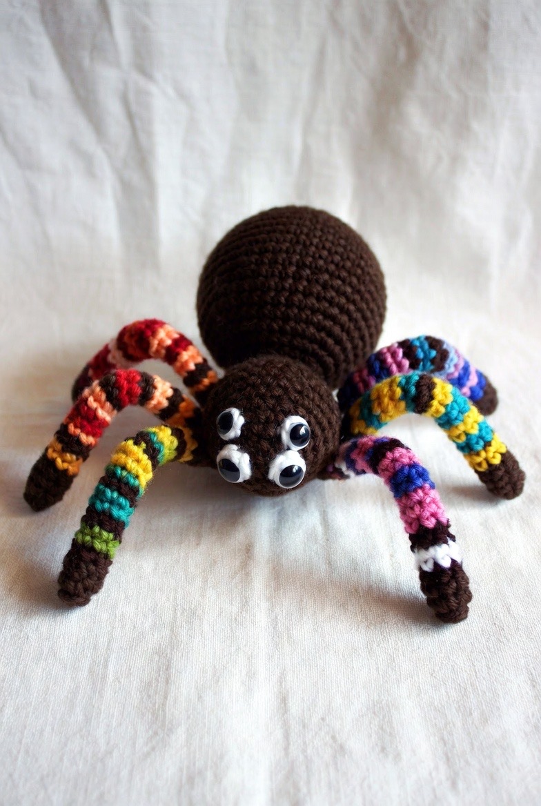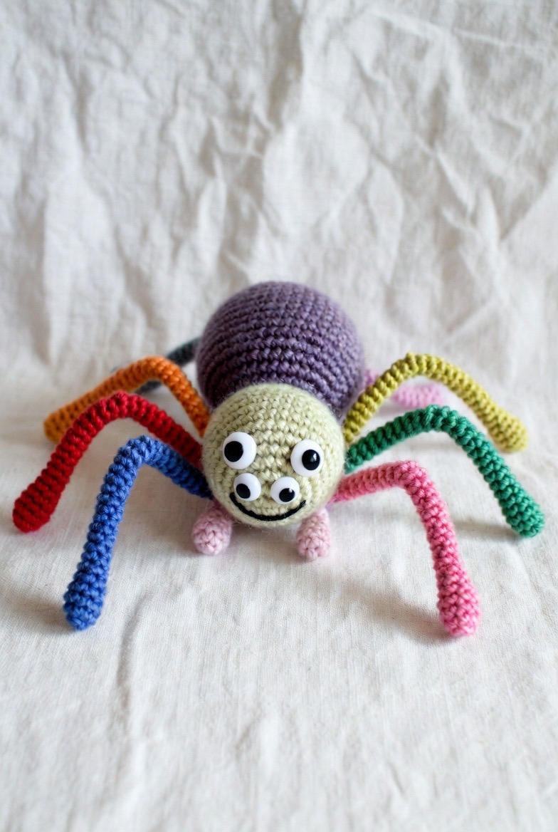 Spiders become much more invited when they have colorful, striped legs. Using a different color for each leg, or alternating black and white, creates a rhythmic look. Give him a slightly lopsided smile and a few extra safety eyes to ensure he looks more confused than predatory.