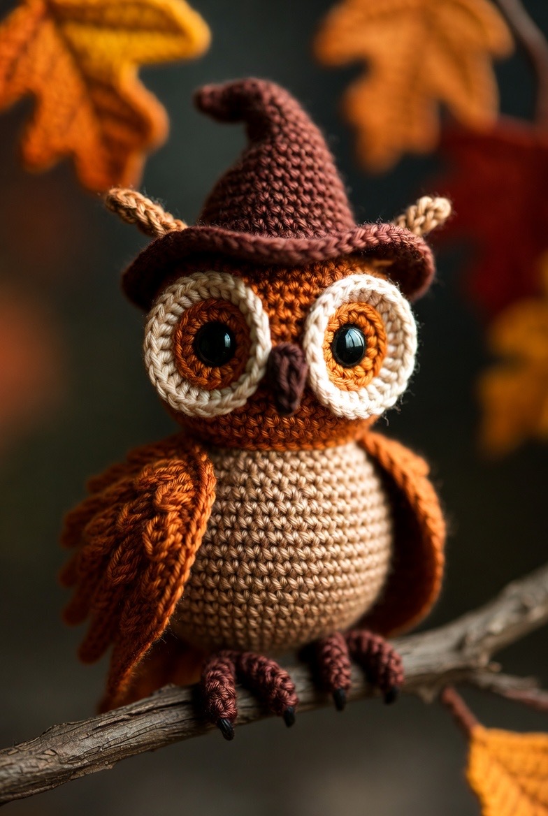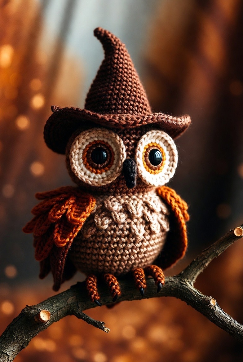 An owl with oversized, concentric-circle eyes looks fantastic when perched on a crochet branch. Use earthy browns and deep oranges to make him feel like part of the autumn landscape. A tiny pointed witch hat on his head makes him the perfect familiar for any magical household.