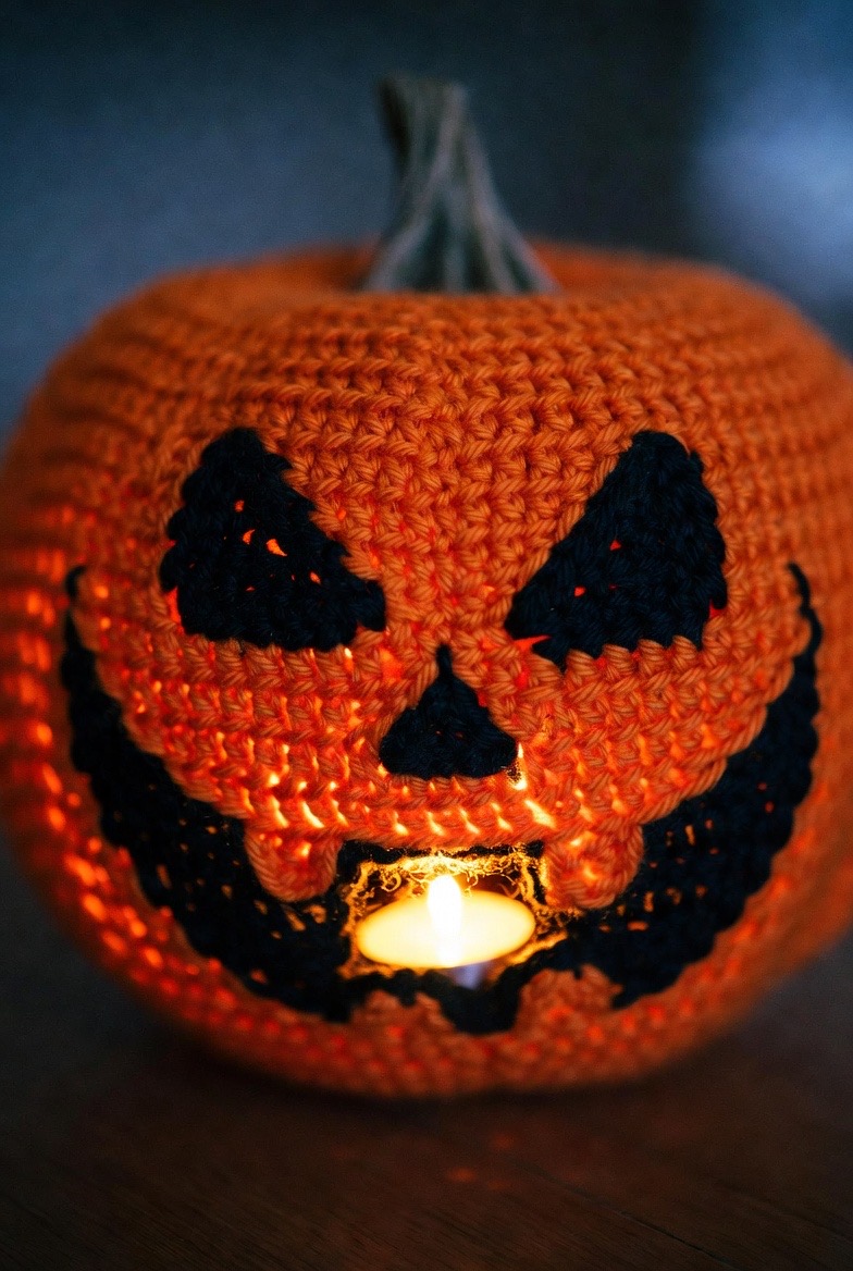 A pumpkin is great, but a Jack-O-Lantern has a soul. Use black felt or dark embroidery to give your pumpkin a wide, toothy grin and triangular eyes. If you use a looser stitch, you can even tuck a battery-operated tea light inside to make his face glow from within.