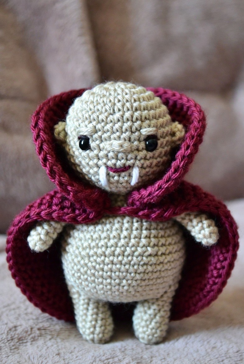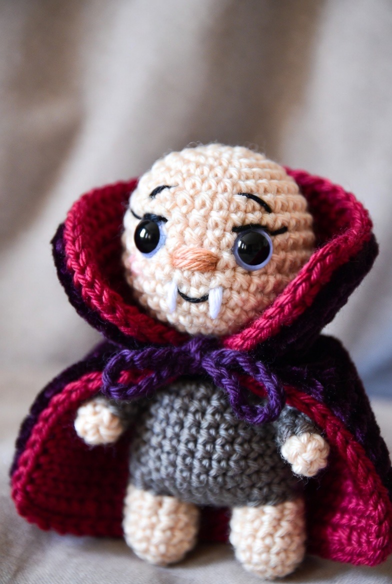 With a high-collared cape and a tiny pair of embroidered fangs, the amigurumi vampire is a delightful contradiction. Use a deep burgundy yarn for the lining of his cape to add a touch of luxury. Despite his reputation, a round belly and a shy smile make him look more interested in cookies than anything else.