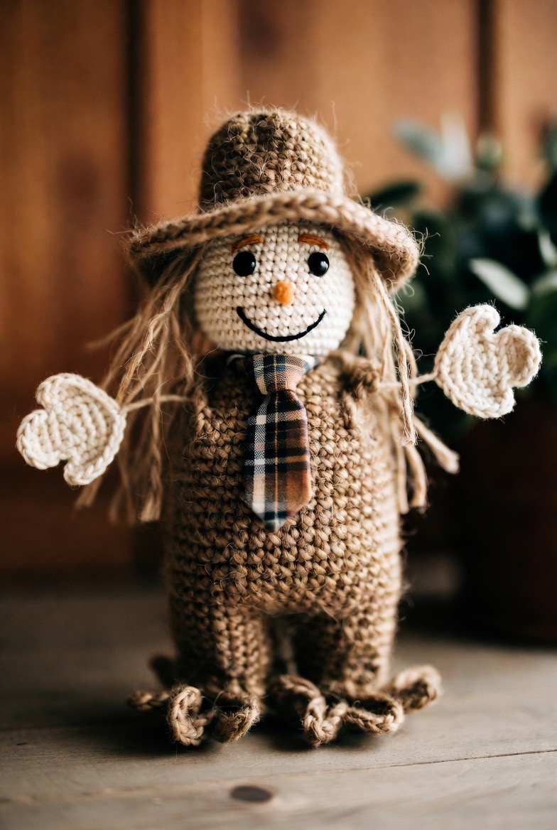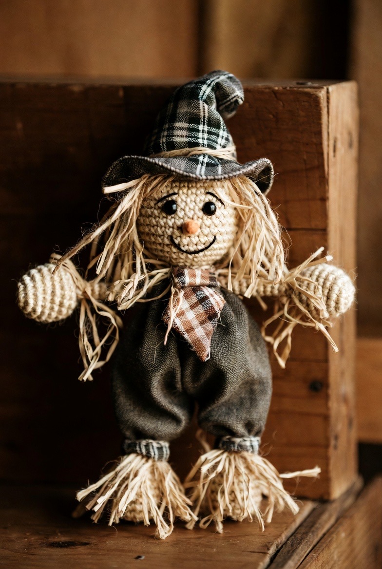Incorporate a bit of the harvest with a small scarecrow. Use a ‘straw’ colored yarn for the hands and feet and a bit of plaid fabric for a tiny necktie. He brings a rustic, farmhouse-style energy to your Halloween display, reminding everyone of the change in seasons.